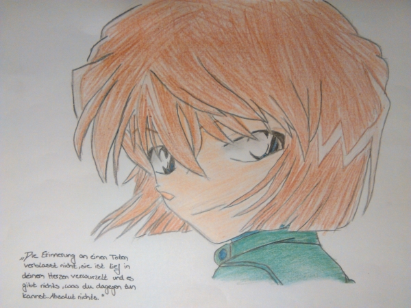Echt gut, auch mit dem Zitat :D<br /> Abgesehen davon, dass das Weiße bei den Haaren ein wenig zu abrupt und unnatürlich aussieht, habe ich nichts daran auszusetzen ;)<br /> Mach bitter weiter :**