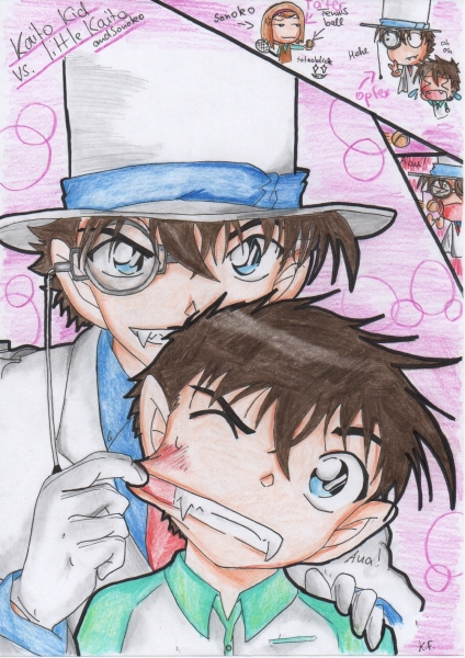 O_____O ....<br /> *______* ....<br /> Wieso haben die so große Eckzähne O_______o?<br /> KAITO = VAMPIR?<br /> O_____O ....oha....cooles Bild<br /> Sieht irgendwie unheimlich und gleichzeitig irre komisch aus ^^<br /> Sonoko hat die ultimative Waffe...Kaito und seine Tennisphobie...tja ja xDDDDDDD<br /> Kaitos Tennisphobie müsste ich mal in einer meiner Fanstories einbringen xDDDDDD
